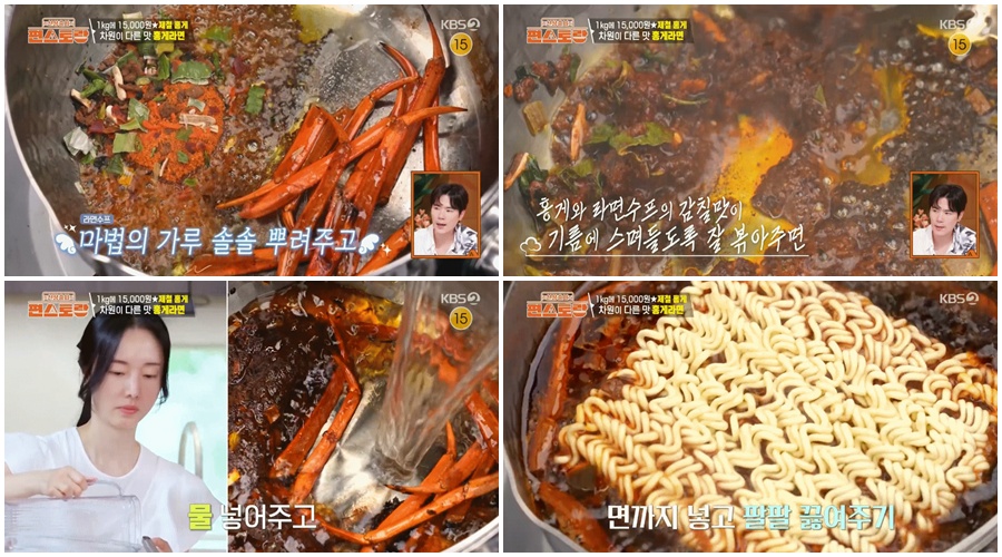 면이 어느정도 익으면 찐 홍게를 통째로 넣어 한소끔 더 끓여주면 완성