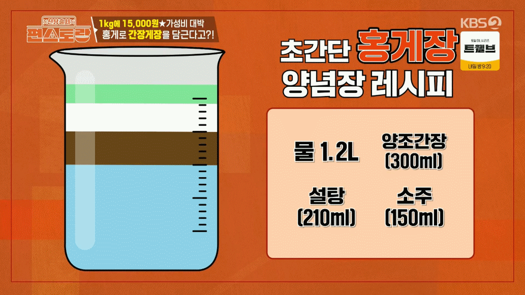[양념장] 물 1.2L, 양조간장 300ml, 소주 150ml, 설탕 210ml