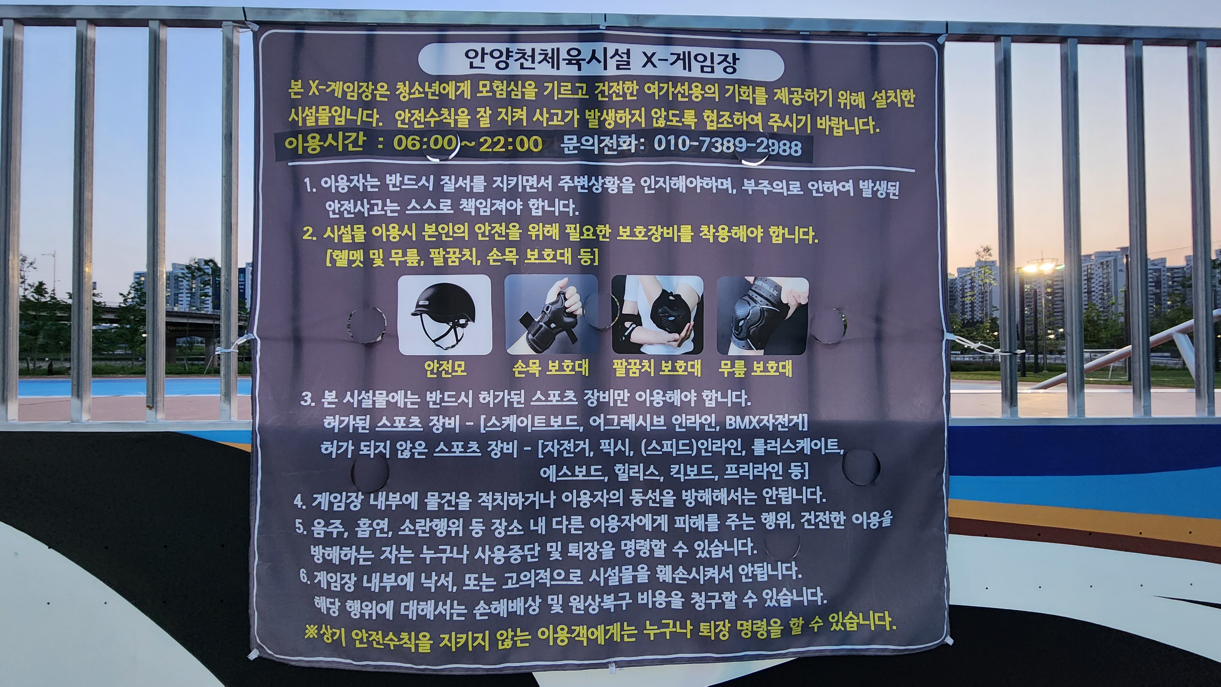 X게임장에 붙어있는 현수막입니다. 안전사고 예방을 위해 보호장비를 착용하고 허가된 스포츠장비만 이용해야해요.