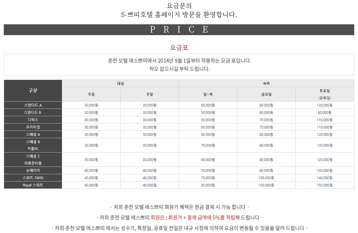 홈페이지에 나와있는 요금표입니다. 구정 전날 1박 했는데 앱 할인때문인지 상당히 저렴하게 이용할 수 있었습니다.